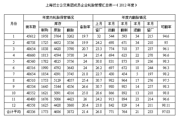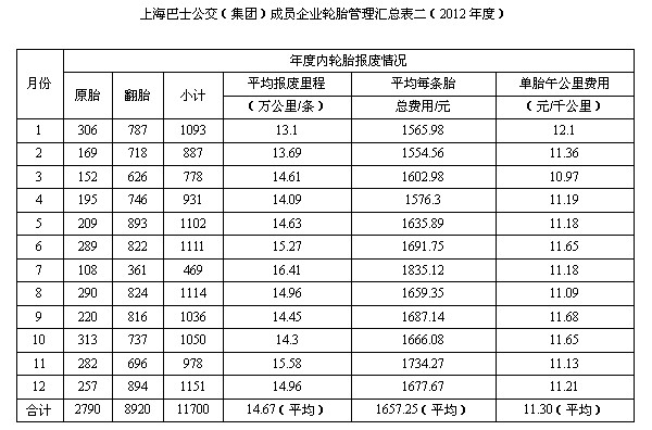 按照2012年新胎購置成本,40.2萬元可購243條輪胎。報表以充分說明上海公交對節(jié)約輪胎資源,所采取的措施、方法是相當(dāng)有成效的,有效履行企業(yè)對節(jié)約資源、_創(chuàng)建低碳社會的責(zé)任。